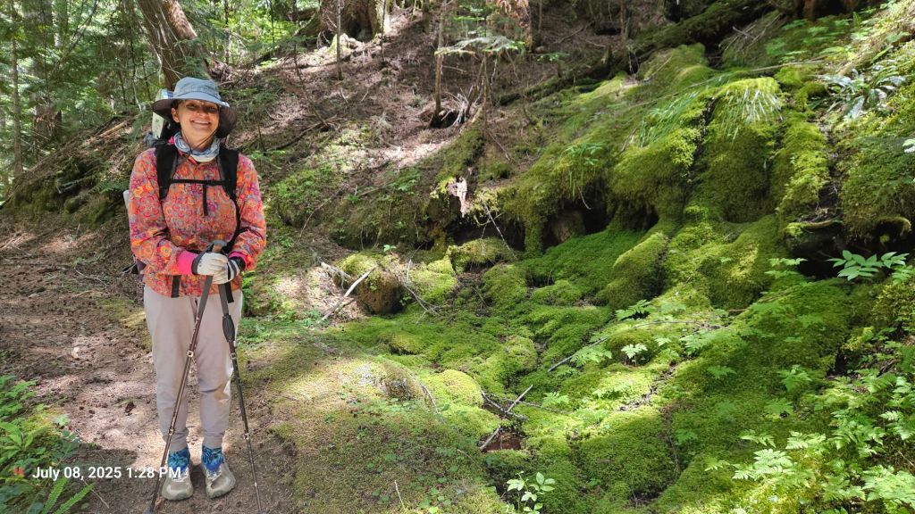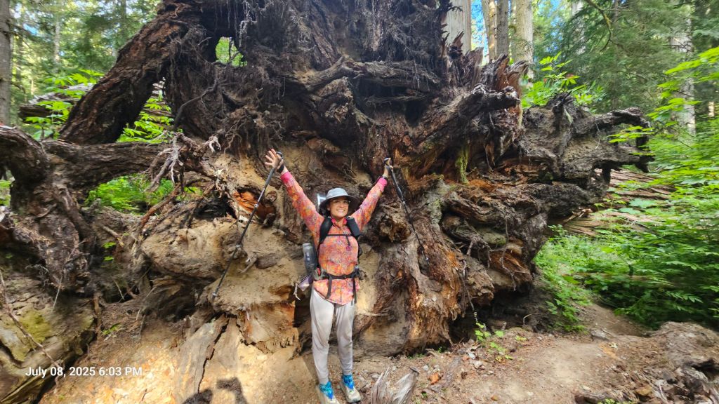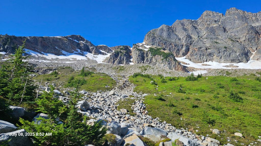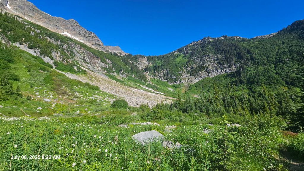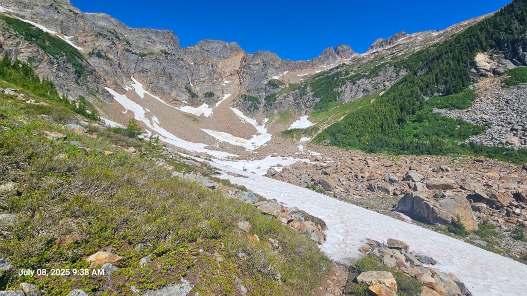 Last night was a bit later than we would’ve liked. The last section of trail was a bit steep and bush wacky. But we had more climbing yet this morning and wanted to beat the heat. We were up a little past 7am and out of camp by 8am. A red breasted sap sucker helped us wake up by playing the drums on nearby dead trees.