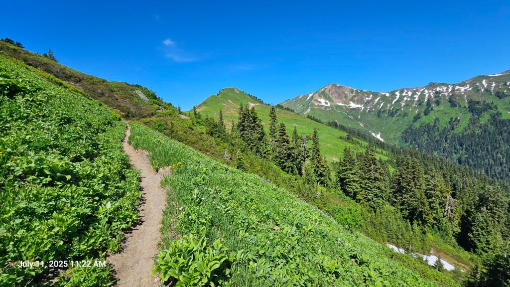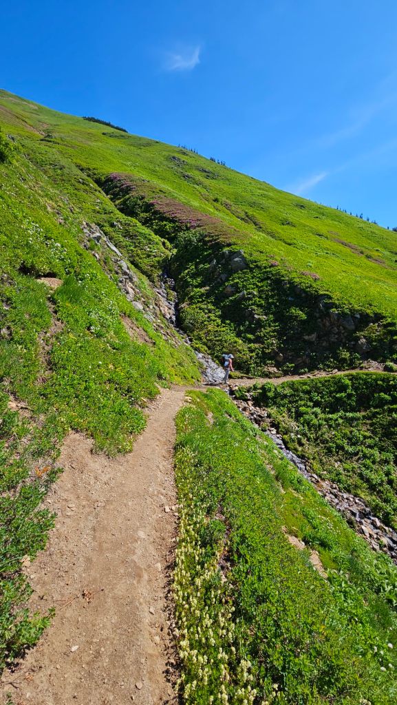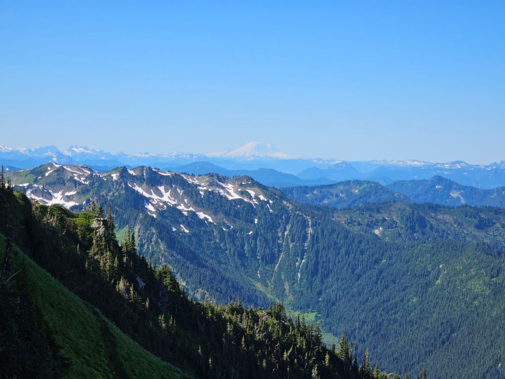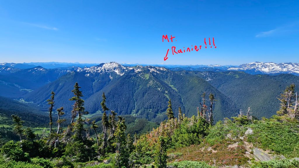When we made it over the crest, we got our first glance at Mt. Rainier in the distance. It seems so far away, but we’ll get there in a few weeks. And the surrounding hillside was stunning! We learned that marmots screaming sounds like cries for help from the distressed. We discovered this amongst the middle of a marmot family screaming at a nearby bounding deer. Ah, nature….