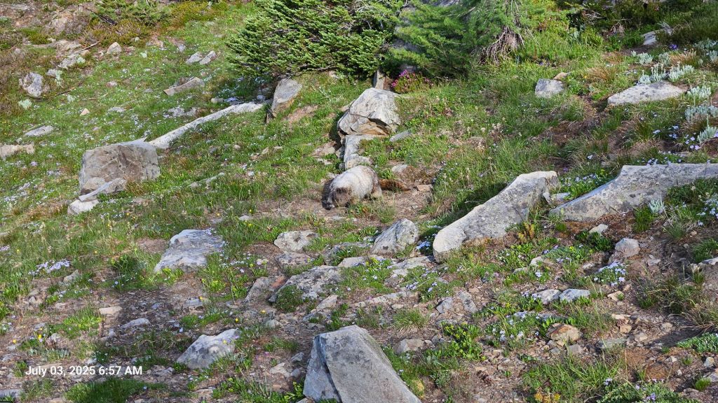 We woke up at camp early to get a jump on the day. Before we left, a brave marmot crept into camp probably looking for snacks.
