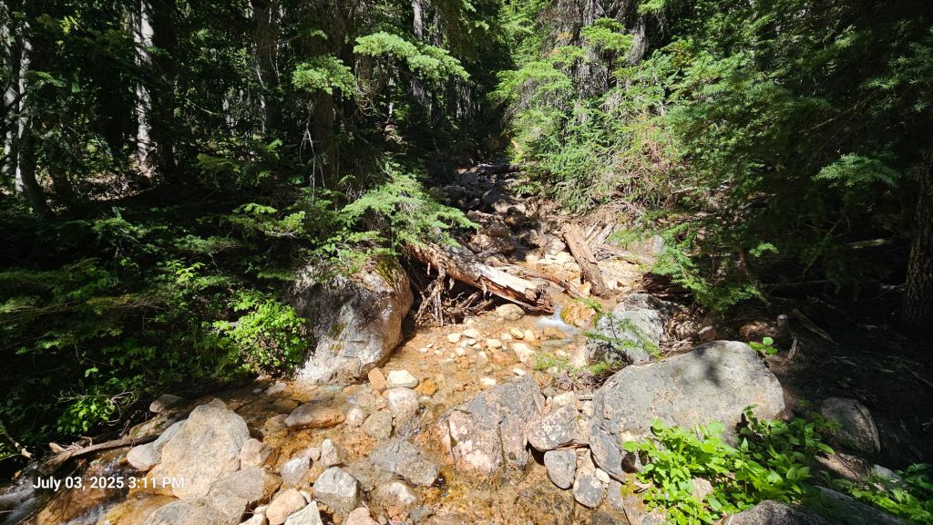 We had a short ascent then a long, long descent – close to 2000 ft. We started on the ridge line, but were bush wacking and climbing over fallen logs by the end. We could hear a river, but couldn’t see it through the bush. Towards the bottom, we saw a sooty grouse family: all the chicks fluttered into the trees while the mom stomped around before taking to the trees herself. We had heard them a few times before and identified them via the Merlin app, but this was our first sighting. When we finally reached the bottom of our descent, we crossed the river and took a quick coffee break.