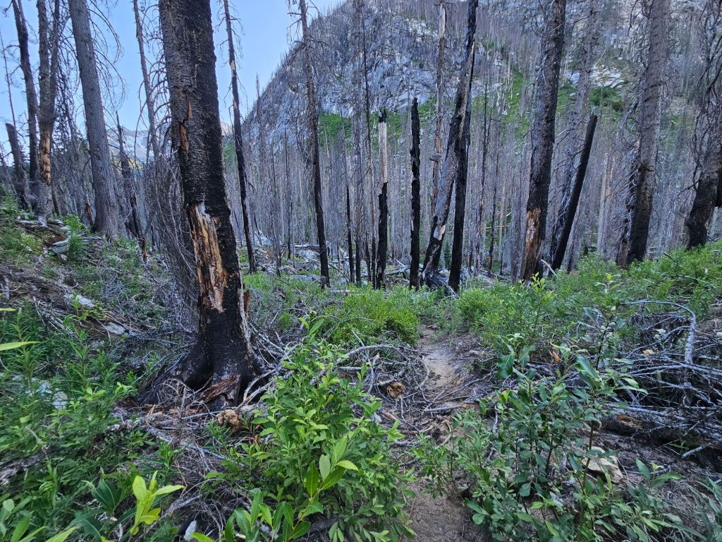 The climb out started fairly slow and the trail was in good condition. However, a fire from prior years made the campsite at 12.3 miles unsafe with many dead trees waiting to fall. So at 10 miles in we stopped for water at the nearest safe camp and saw how we were doing. It was either setup camp here and have a difficult morning or push on to the next camp 5.5 miles ahead. We read that the trail leading to that camp was a bit overgrown and with many downed trees.