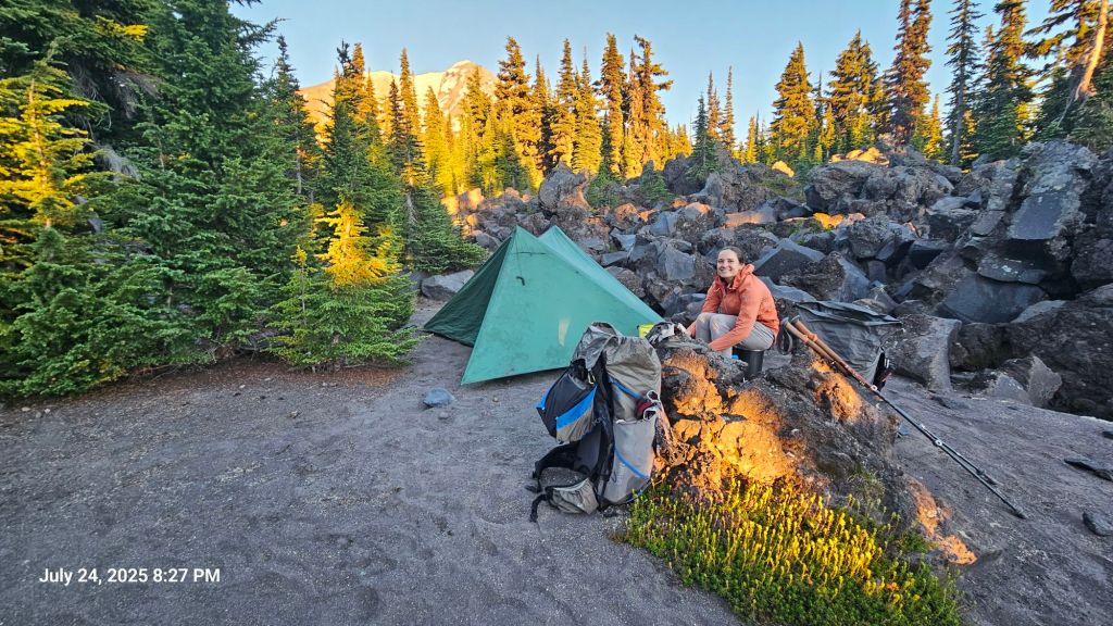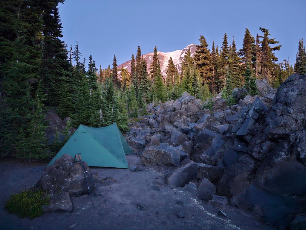 In the last stretch of the day, we crossed a silty river from the glacial melt water and wove through another lava flow cinder field. We set up camp at dusk and had great views of the sun setting through the trees and turning the mountains purple.