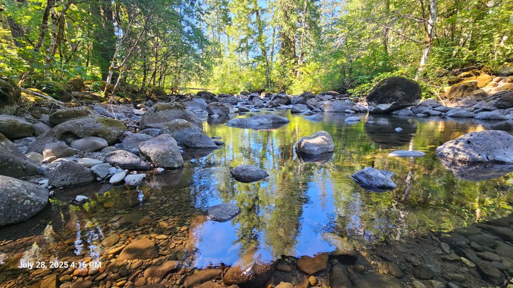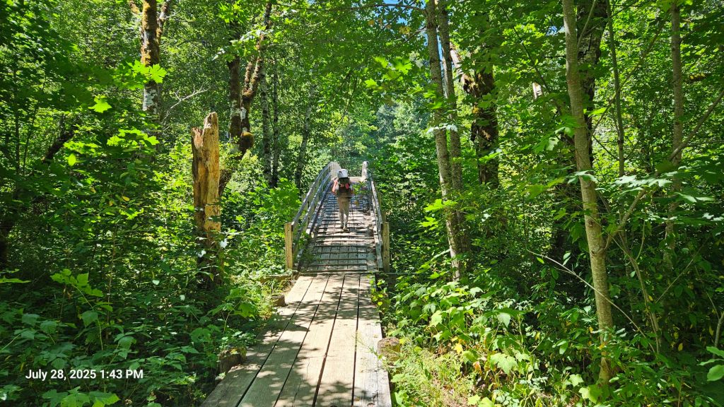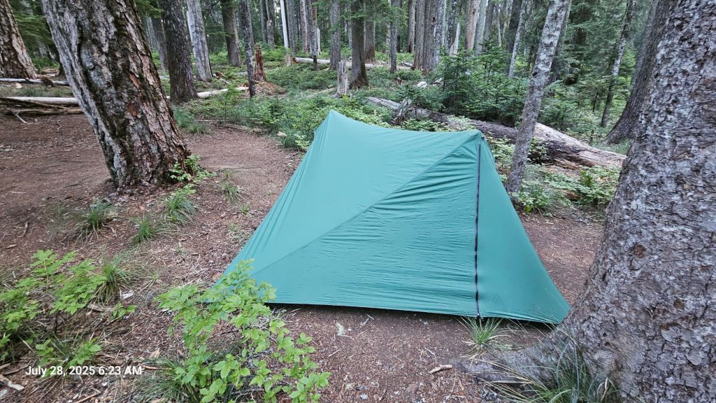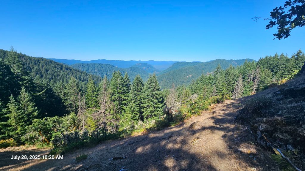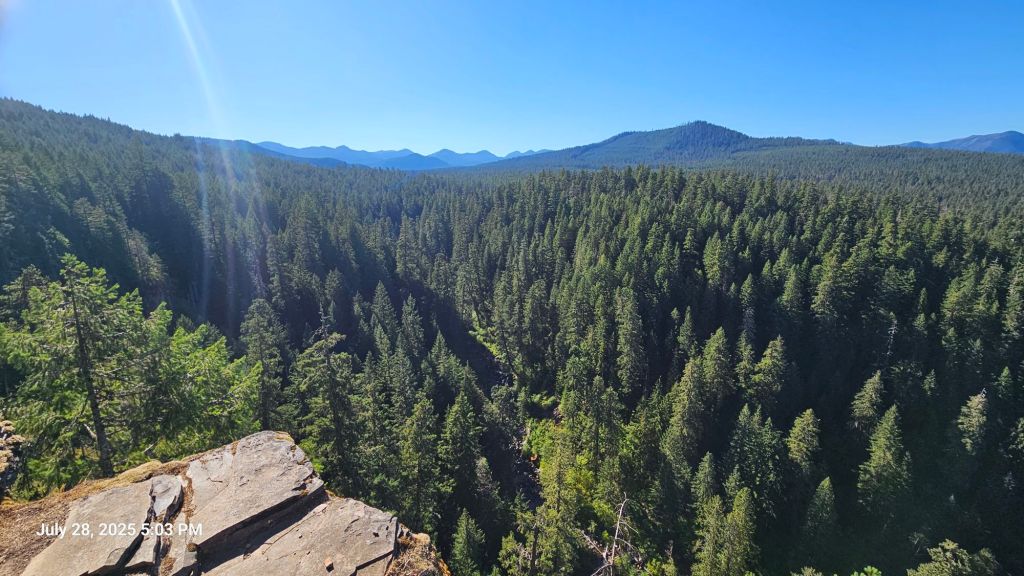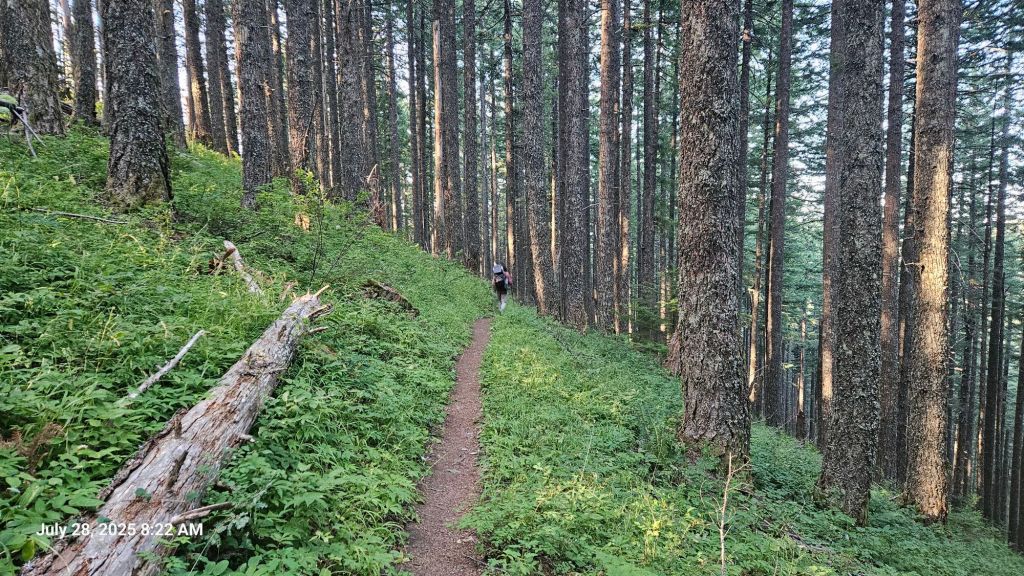 We got off to an earlyish start to finish climbing our hill we started last night. The trail was very well shaded which helped as it heated up. We picked more huckleberries and some thimble berries as we walked along. Eventually, we came to a good view of Mount Hood.