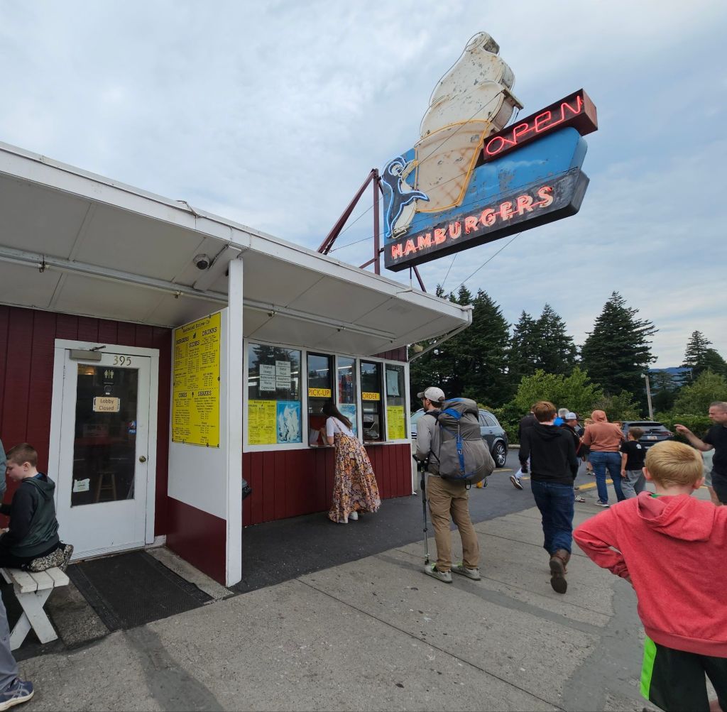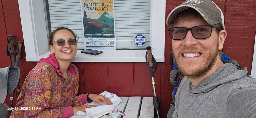 We mailed some things back home that we weren’t using, and Alex mailed her new shoes down trail to Crater Lake. Jason inquired with the postmaster about his new pack in the mail. It arrived in Portland at 7:30ish. The postmaster said it missed the truck out of Portland and would likely be delivered tomorrow, but could even be the following week. The postmaster was super nice and accommodating to hikers. She knew the whole routine, and it was a wonderful post office experience. Because this pack was delayed, Osprey already sent another pack down trail. We decided to press on and hope the shoelace/pen cap/duct tape repair continues to hold. The rep at Osprey has been great and very sympathetic to the whole situation.