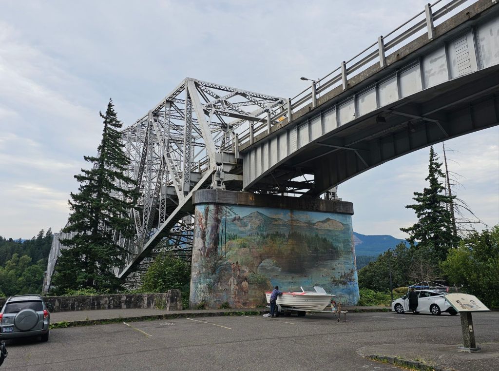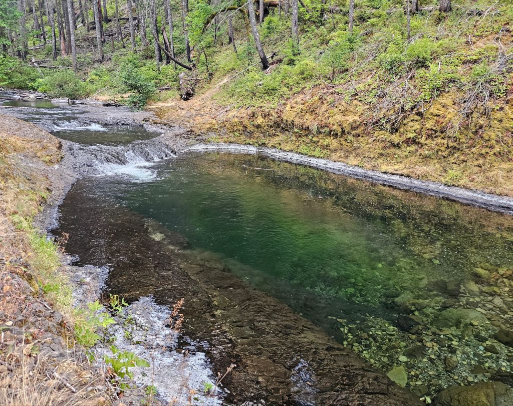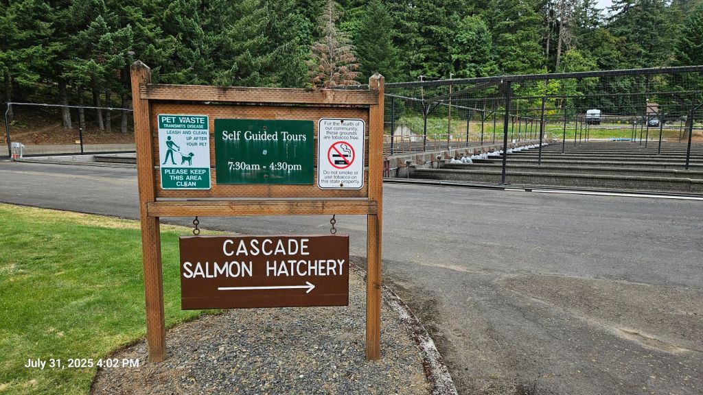 Due to a fire in a previous year, there was an alternate route to get around the burn scar. We briefly followed the Columbia River west and saw a pair of pileated woodpeckers in an old growth section along the river. The alternate route also took us past a salmon hatchery which taught us some important salmon facts for the next time we play bar trivia.