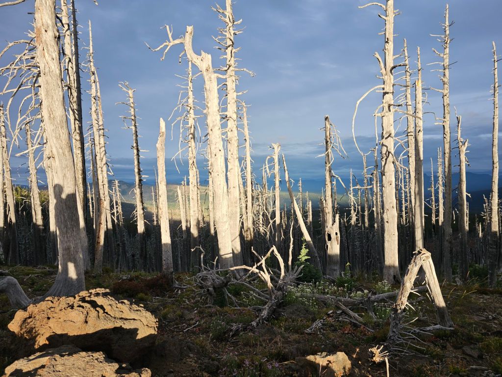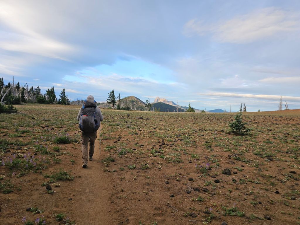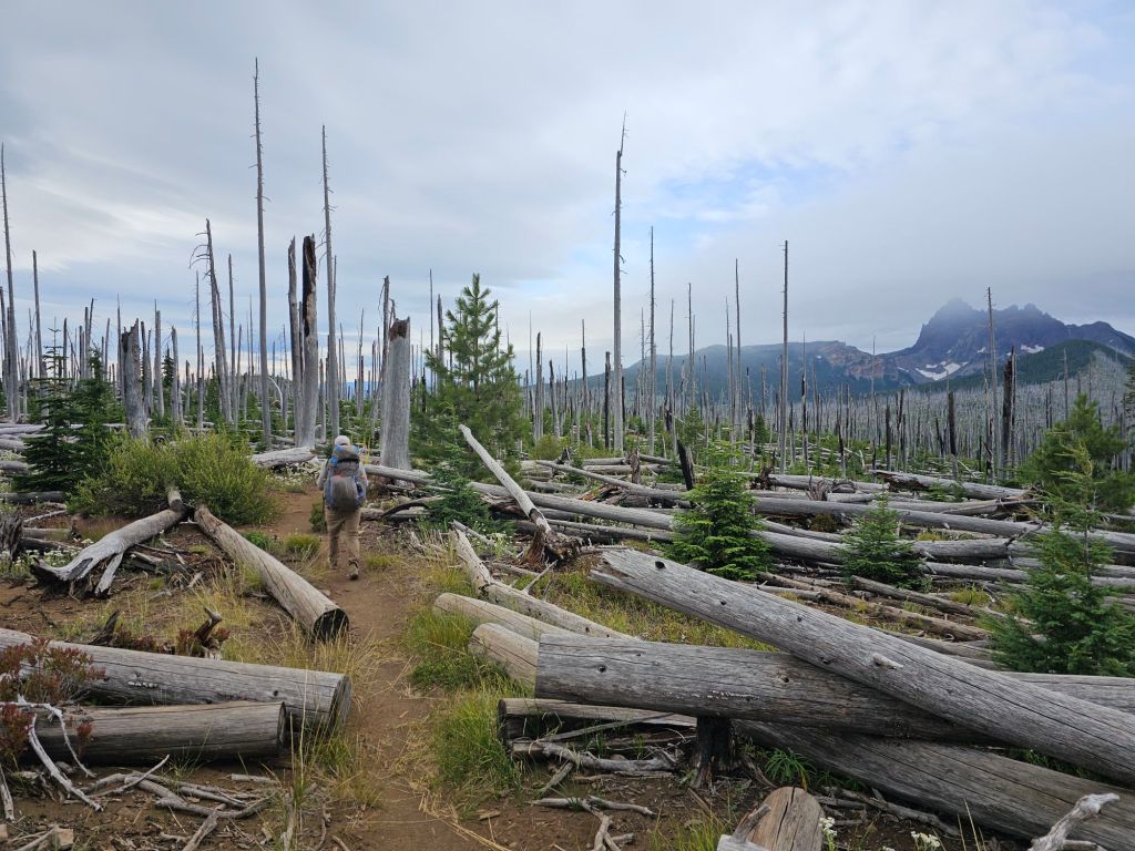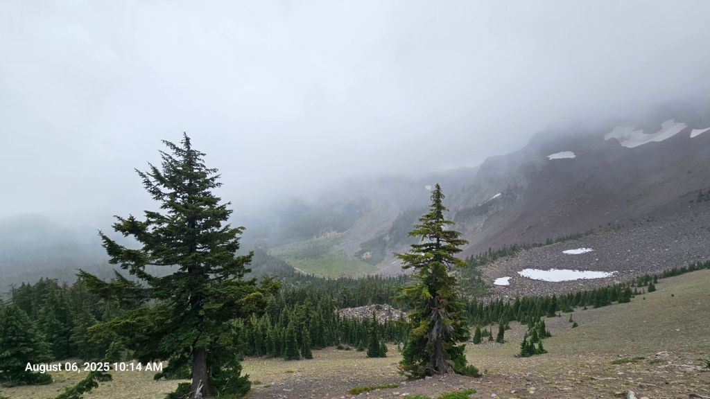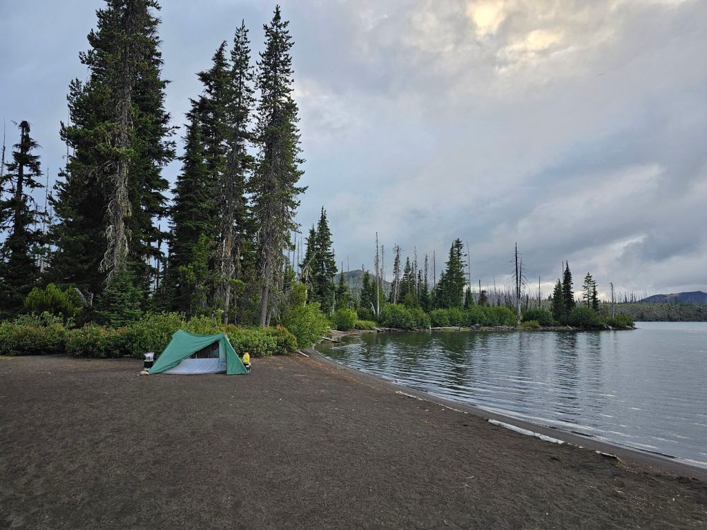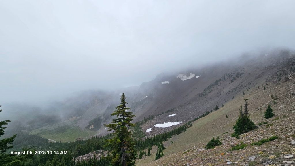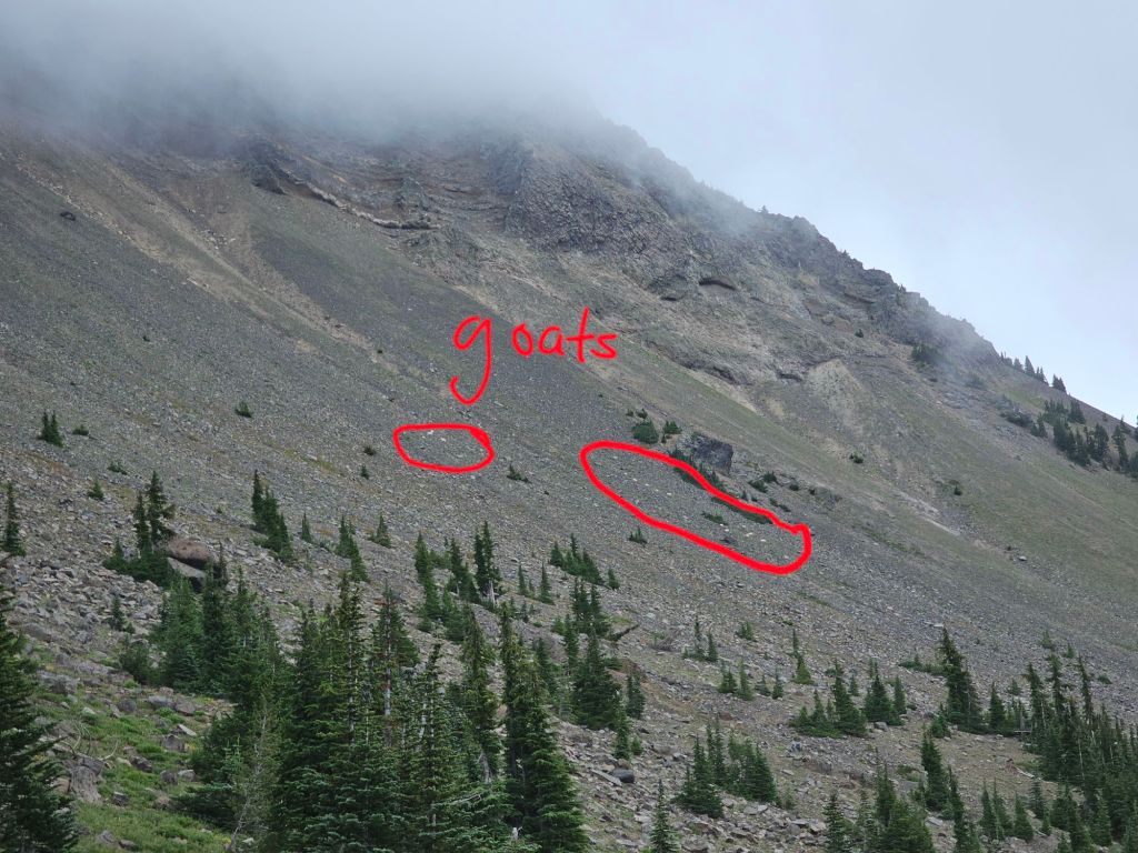Early start to the day! Up at 5am and out the gate by 6am to make it to the Big Lake Youth Camp in Sisters, OR. The trail was super cruisey. Although we went through a burn zone, the cloud and rain kept it cool and pleasant. We had a few moments of sun early in the morning before it rose above a thick blanket of clouds. On the way down, we saw a herd of mountain goats sitting on the mountain slope. We didn’t know they herded, but we think it was a group of moms with kids, perhaps banding together for protection.