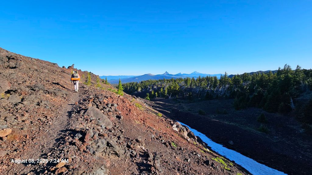 We emerged from the forest to our first large open field where we could see the trail for over a mile. This was a sneak peak of what the desert section of southern California might offer. The field was bordered by a lava rocks and we got a great view of the mountain peak at the top.