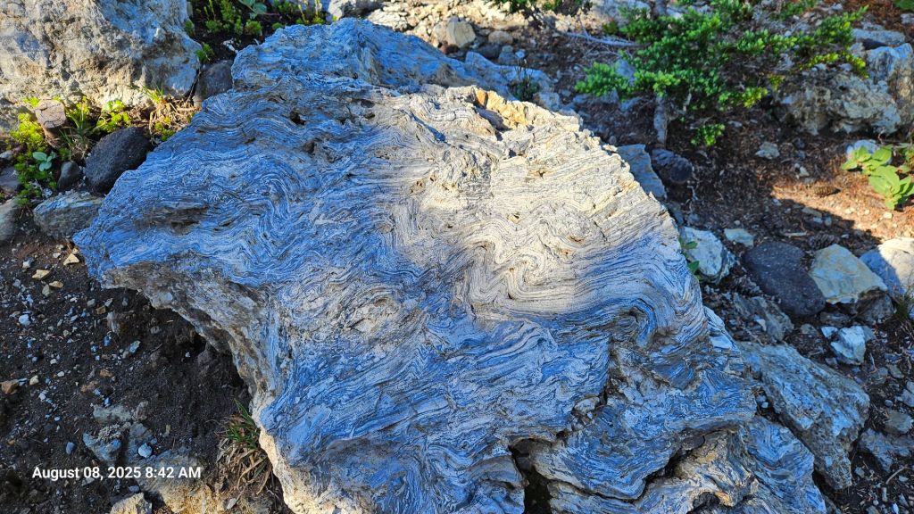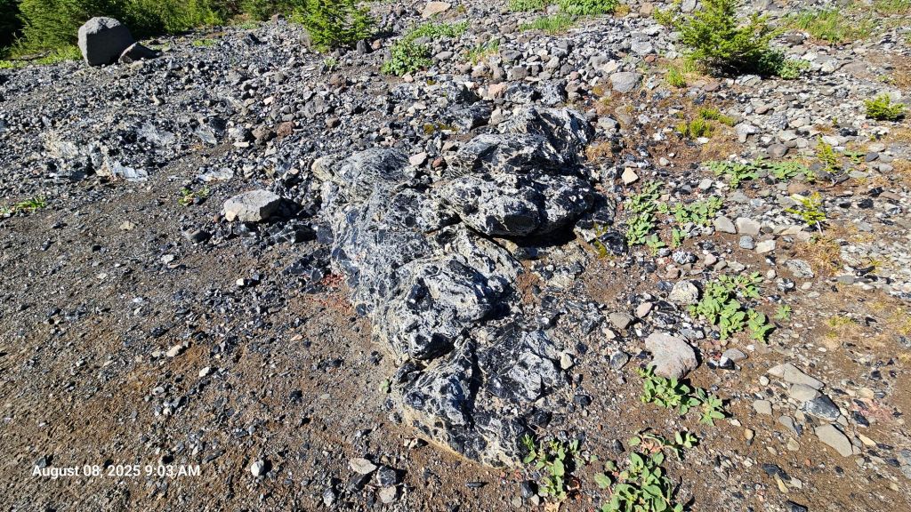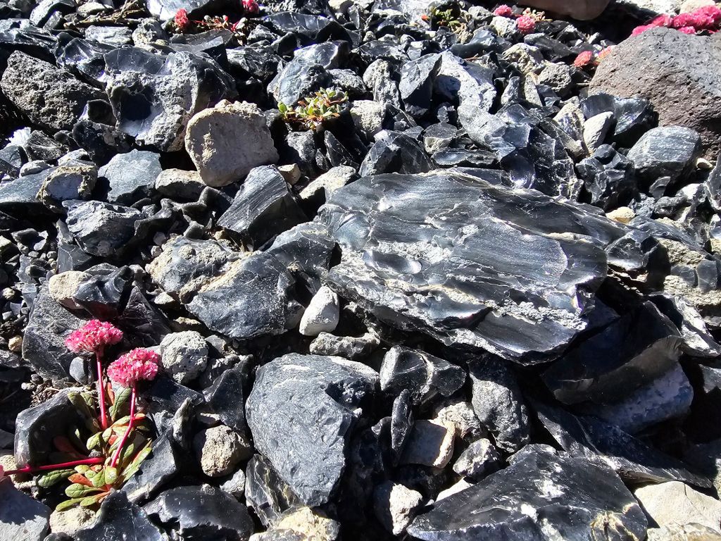 When we got to the obsidian fields, the ground was shining with the obsidian reflecting the sunlight. The pictures won’t show how spectacular it was. There were hillsides of scattered obsidian. The trail was lined with it. Huge obsidian boulders occasionally dotted the landscape. The cliffside had dark black pockets of obsidian.