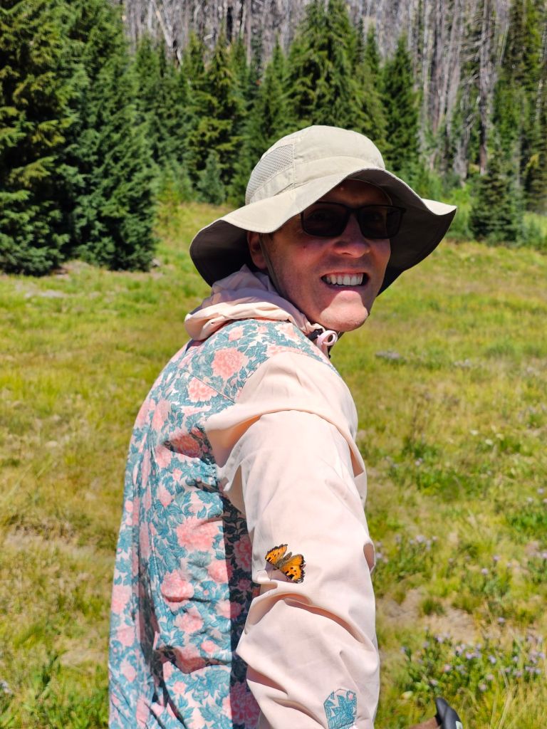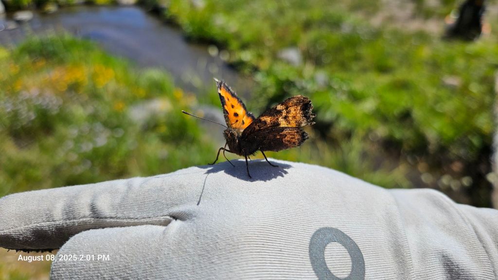 We’ve also been seeing tons of butterflies or moths with orange wings. There are sometimes literally hundreds flying around. Some take an interest to our shirts (or sweat on the shirts).