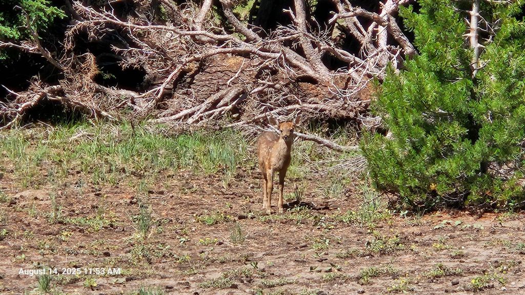 As we circled the lake, we came across a few critters; lots of Clark’s nutcrackers, ground squirrels, chipmunks, and juncos. We also saw a mole(?) digging out its hole. And, we came across a fawn munching on a tree.