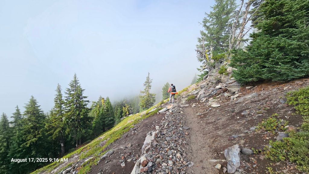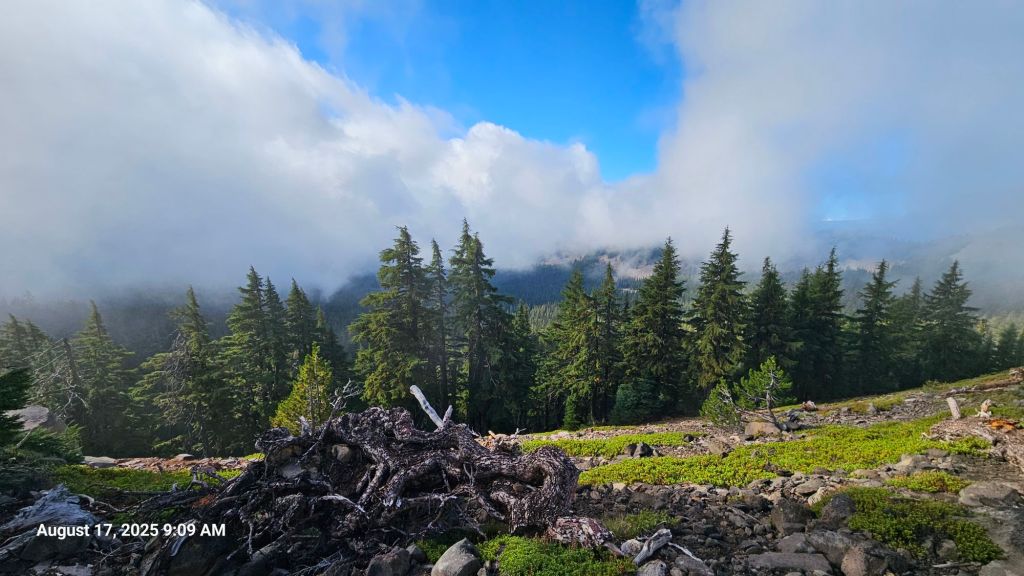 We got water at a creek before a 600′, 1 mile climb. Thankfully, maybe, the clouds kept it cool but hid the view on the other side.