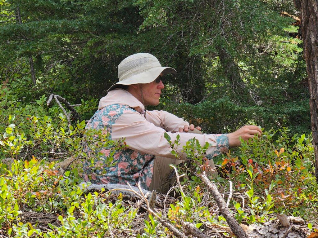 After the climb down, the trail was fairly uneventful. We had flat-ish ground and decent cloud cover. We took a break to munch on some huckleberries lining the trail.