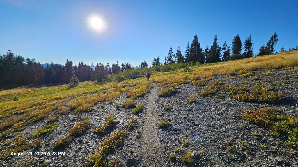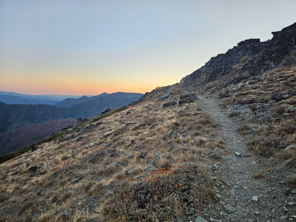 We had heard rumors of a big blowdown section, but we thought we would hit it tomorrow. Unfortunately, we hit it today, and there were a few challenging miles. Lots of blowdowns, overgrowth, trail washouts, and exposure. Our paced slowed to less than 1 mph as we navigated this difficult terrain for about 2 miles. We didn’t get any pictures of the blowdowns, too focused on our footing as the sun fell lower and lower. Once the blowdown mess was behind us, we enjoyed hiking a clear trail in the purple and orange lighting of dusk.
