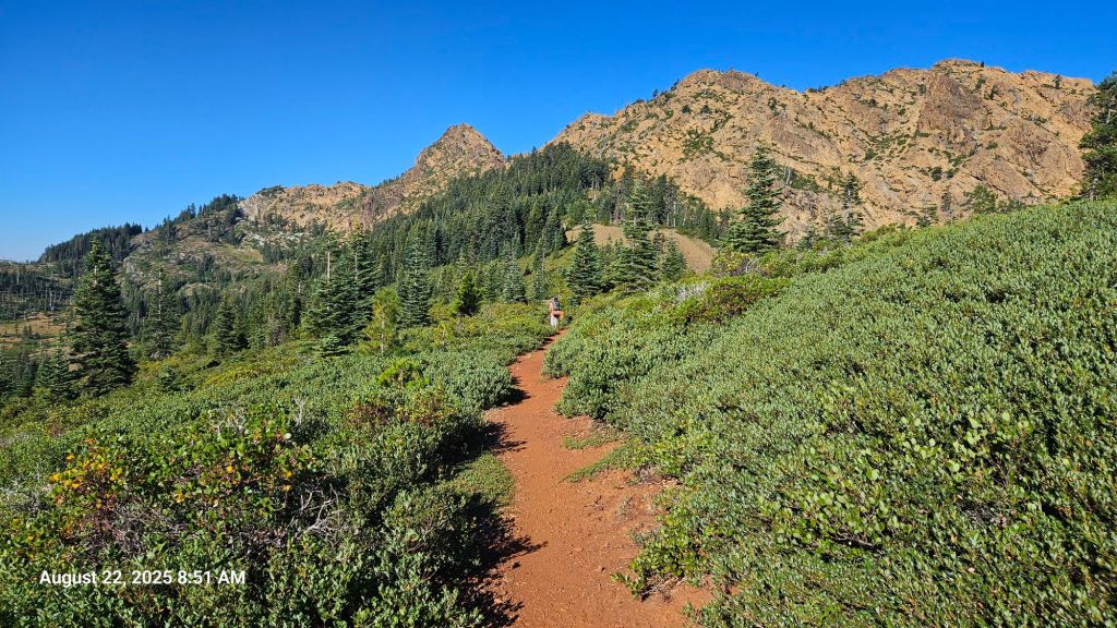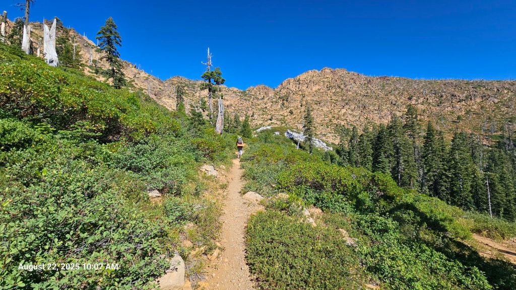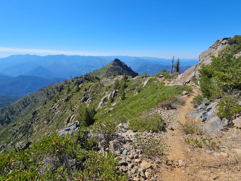 After getting to camp in the dark last night, we slept in an extra 15 minutes and had pancakes for breakfast (single-serving cups of pancake powder, meant for microwaving, mixed with boiled water). The 3-day food carries are nice because we get more treats rather than prioritizing small foods that fit in our bear cans. The morning breeze was unusually warm, an ominous sign for the day. As we hit the trail, the others at the camp, two northbounders, hadn’t stirred in their tents yet. Sometimes we envy the slower pace of the NOBO hike, although we do not regret our decision to hike SOBO.