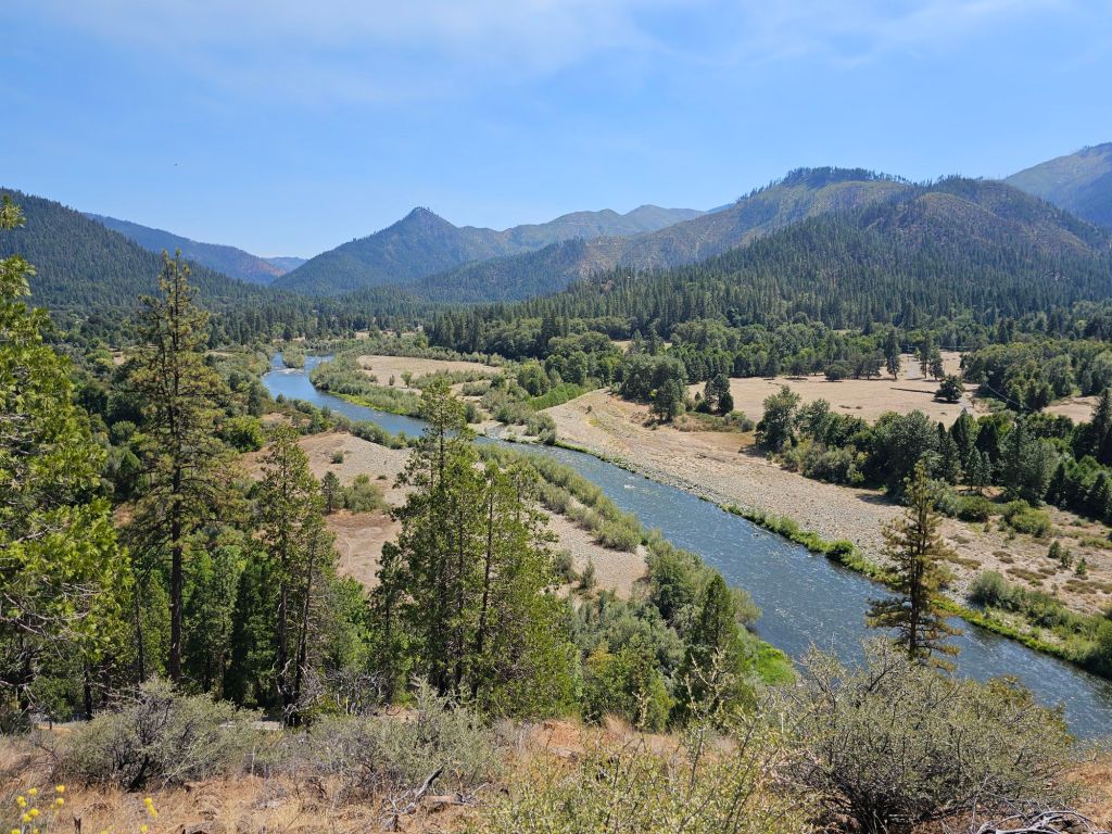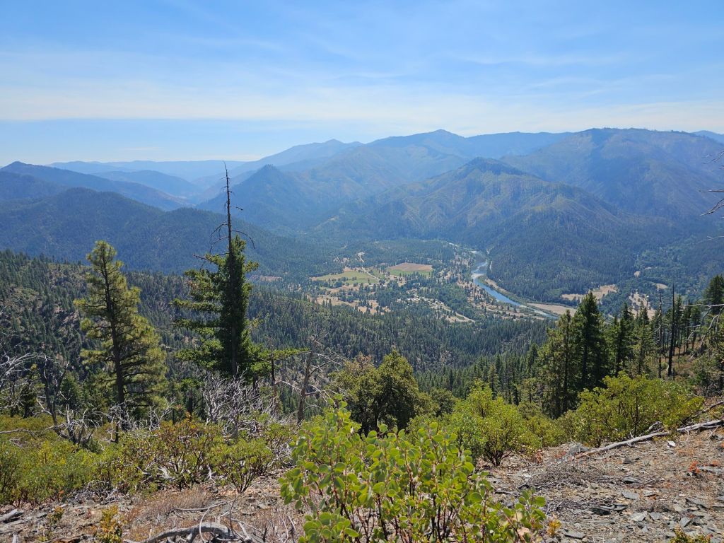 The day grew hotter and hotter. We reached our peak then had a steep six-mile descent down into Seiad Valley. This is where we had originally expected to find the blowdowns that had surprised us last night. Fortunately, downed trees were far and few between. It was the heat, exposure, and constant downhill (rough on sore and swollen feet) that made it challenging. Even with light packs, it was just hard. Type 2 fun, perhaps. Maybe Type 3.