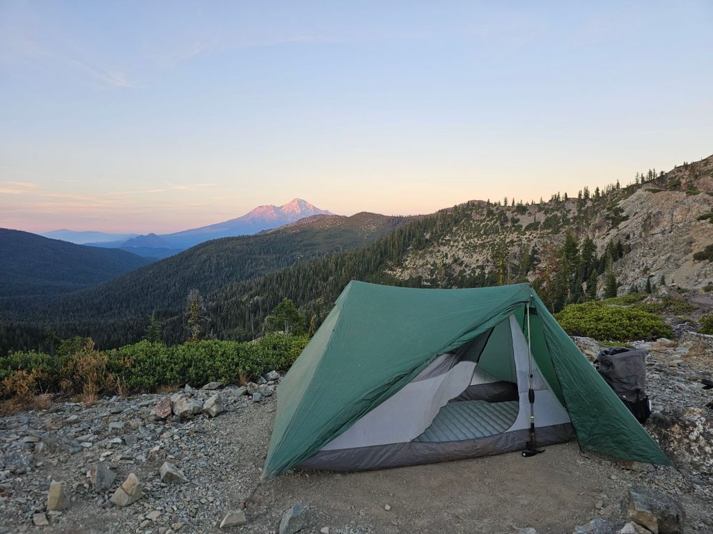 The trail then got a little more challenging, but not by much. Today was the kind of day where we were easily going faster than 3 mph. That meant longer breaks, a long lunch, and arriving to camp well before sunset. We settled for a spot with a killer view of Mount Shasta.