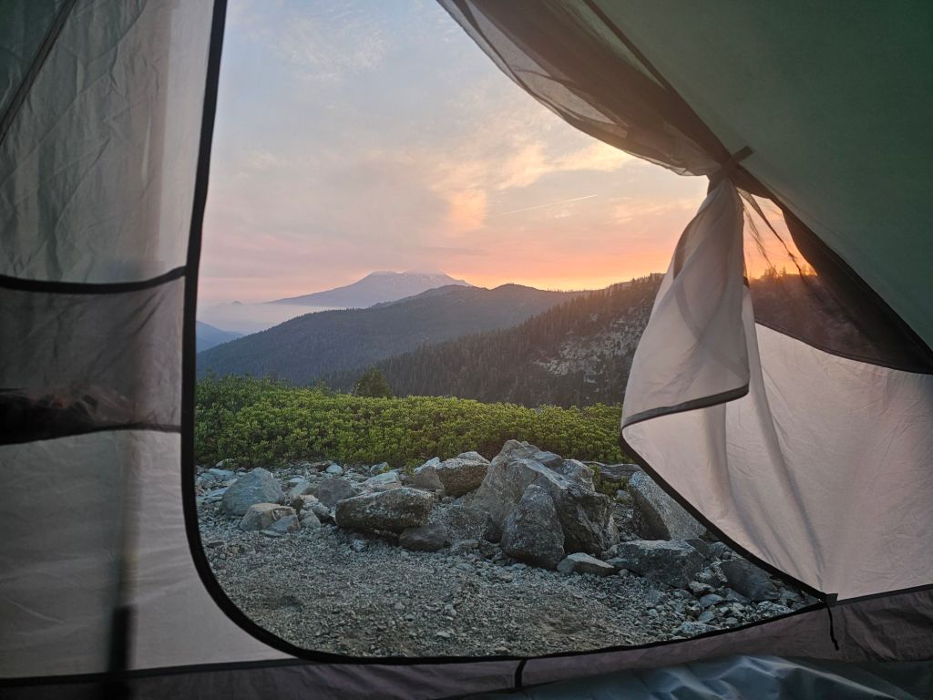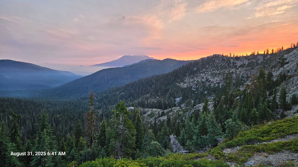 Our camp had a great view of the sunrise on Mount Shasta with the sun lighting up the mountain and the fog in the surrounding valleys.