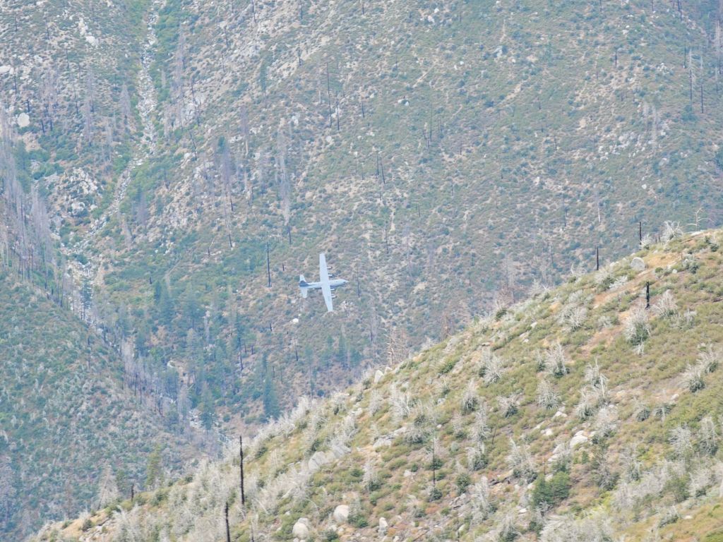 The cool weather meant we didn’t have to race out to beat the heat. The humidity, however, we couldn’t escape. Relative humidity is weird. Because of the rain and whatever weather front was moving in, the humidity was >90%, according to the weather forecast. And boy-howdy, did we feel it when we made the climb. At over 4000′ in 6.3 miles, it was our steepest significant climb to date. We rose above the planes! Or, at least one military plane doing a low-elevation flight through the canyon we now overlooked.