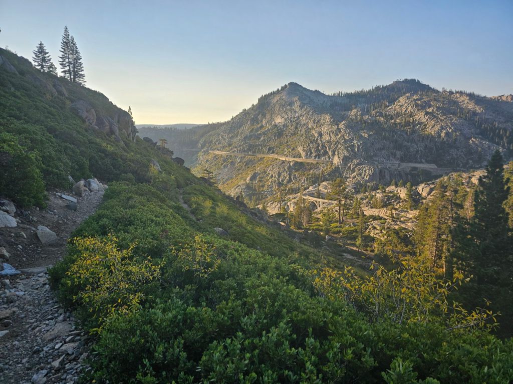 The weather was great! It was sunny but not blistering. We crossed over Donner Pass and read about the events on plaques. If you don’t know about the Donner Party, it’s worth a Google, although it is not a pleasant story. A group of rock climbers (? Or intense construction workers of some specialized sort) cheered us on as we crossed the road.