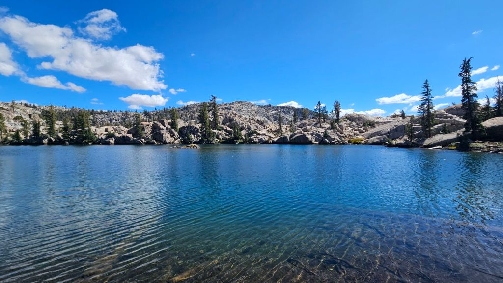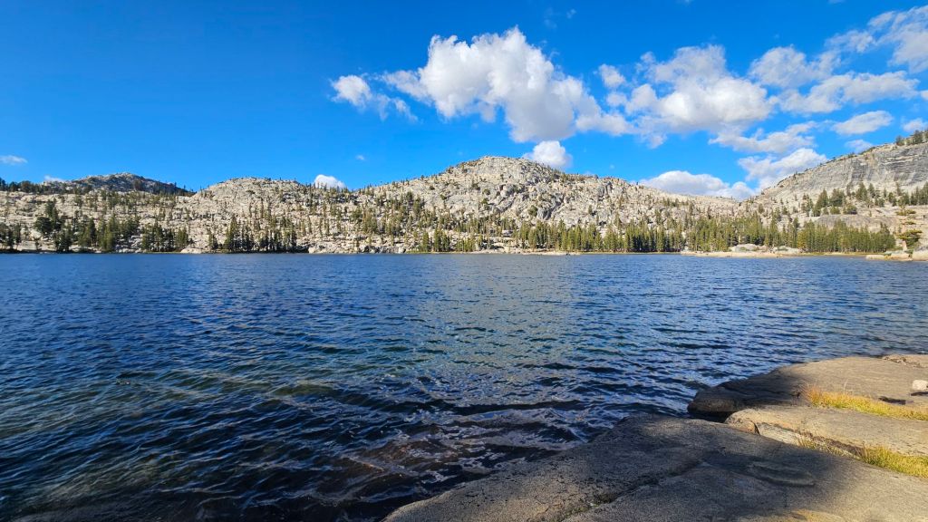 We found our first river crossing since Washington that required us to take off our shoes. The water was only calf deep. We then ascended about 950′ in a mile (that’s an 18% grade!). We lunched at a small lake way up high. If only we could’ve called it a day then.