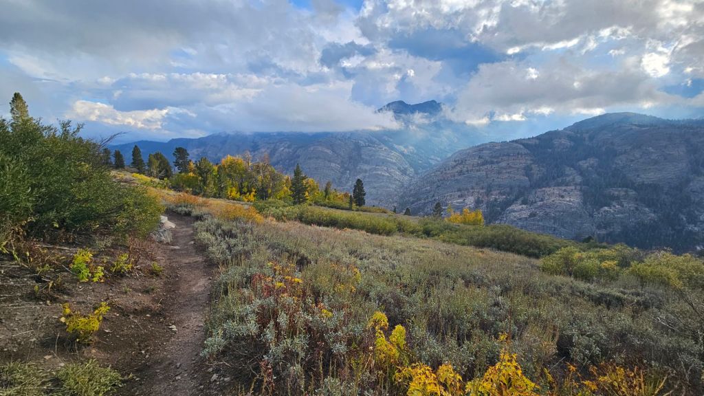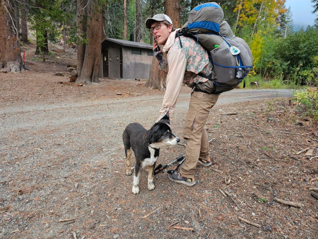 We scooted down the ridge towards our campsite. Then we came across a scared dog alone in the road. It kept looking off in the distance, clearly trying to figure out where its people went. A car passed, but the passengers didn’t recognize the dog. After coaxing the dog close enough to grab its collar, Jason called the number on the collar and waited for just a few minutes for its owners to show up. We enjoyed getting to hang out with the dog for a bit, but please don’t hike with an unleashed dog on public wilderness trails with leash laws. It can be dangerous, for the dog, wildlife, and others.