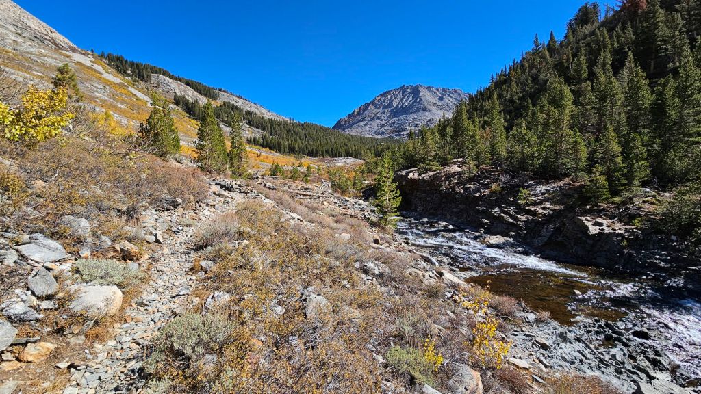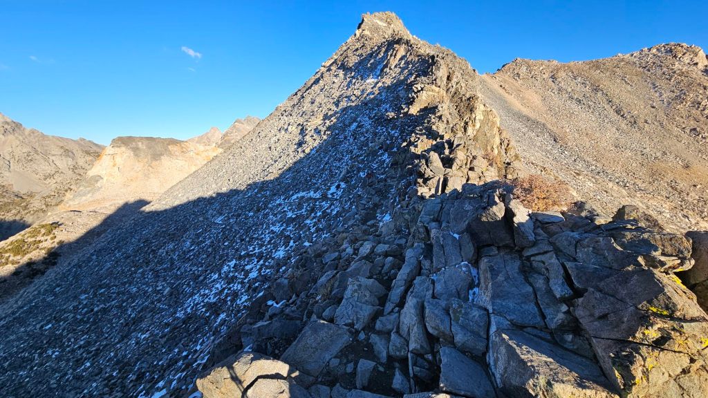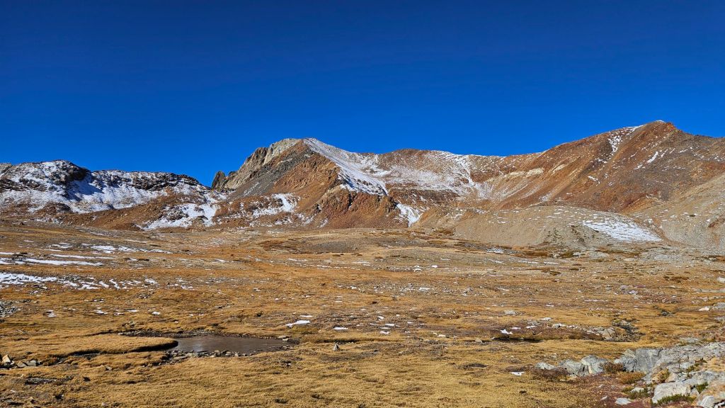 Unfortunately, we couldn’t stay at the lake for the rest of the week. The final push up and over the pass was steep. Some sections were >900 ft/mile. And at close to 12,000′ elevation, we were puffing for air as we made the climb. We reached the top about 45 minutes before sunset, and already the air was cold.