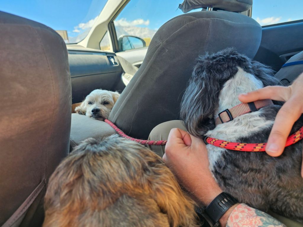 The dogs took to us quickly. Marley, who required a warning from Richard, was unusually well-behaved and fell asleep on Jason’s leg. Finley sat between us before jumping up mid-drive to lay on Richard’s lap. The eldest pup lay up in the front seat with a paw resting on the center column. Bentley, presumably imprisoned for some heinous crimes, was in a crate in the back. All the dogs quieted and napped as we drove up to the trailhead and talked with Richard. Also, the back pocket of the driver’s seat was packed with tennis balls. It was a lovely drive.