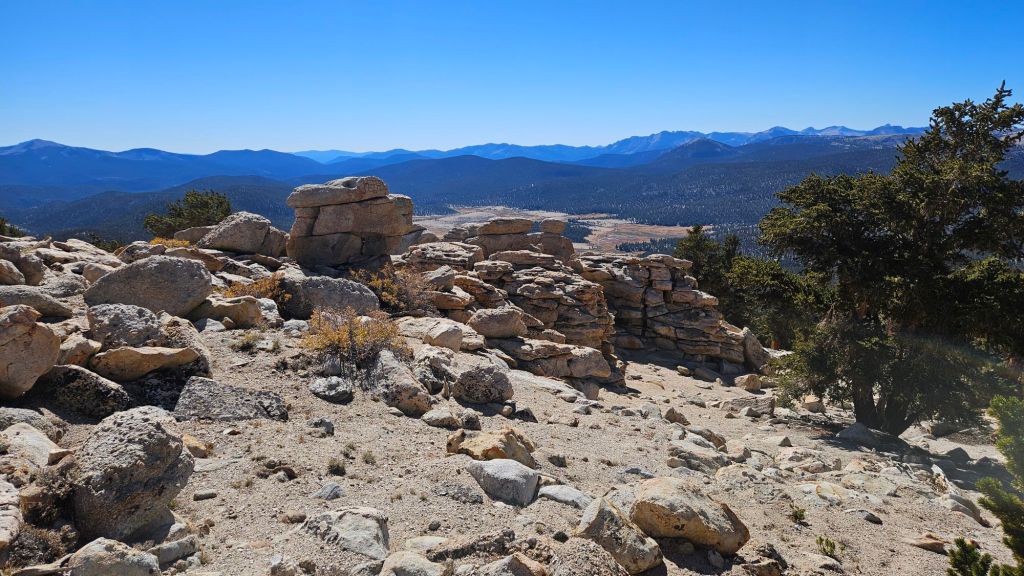 We spent most of the day in the high forests. They’re notably sparse with sandy soil. Many of the trees had burn marks from a fire, but the height of the littlest trees implies the fire was perhaps 10 years ago. These trees are just hardy and slow growing in the short season. Occasionally, we reach the top of the hill and see the now distant peaks of the High Sierras or an exposed hilltop above the treeline.