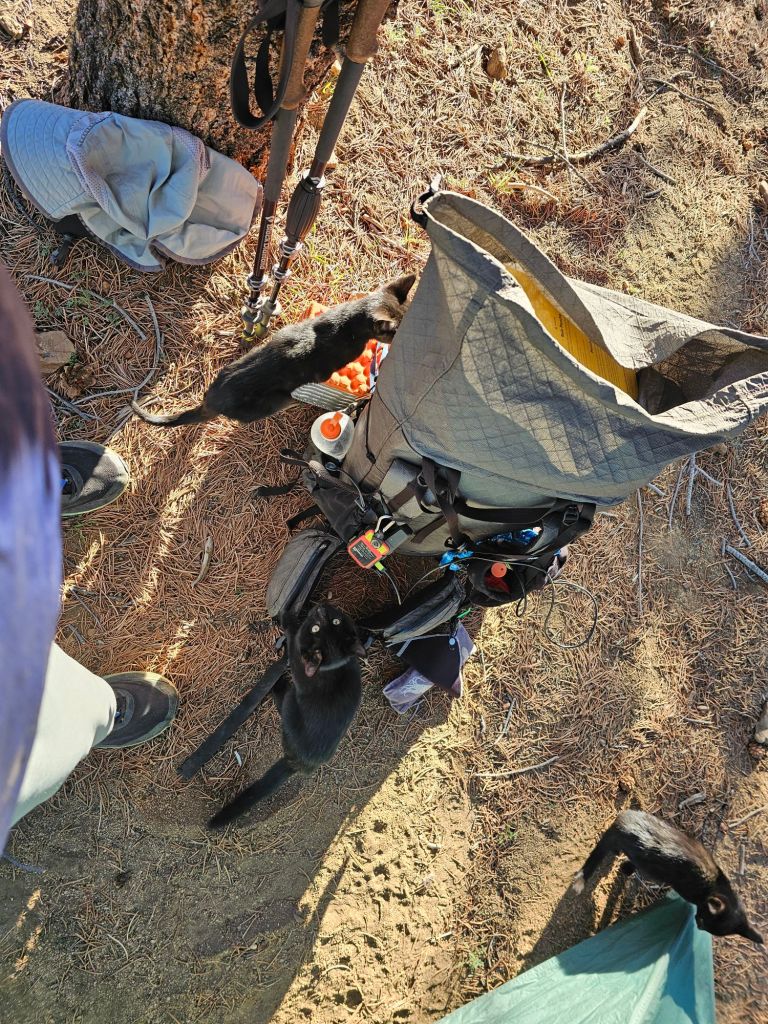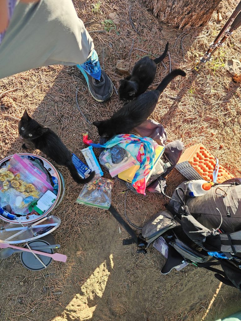 As we packed up camp, we were swarmed by a trio of kittens. They were enthralled with all the straps, strings, and crinkly bags of food in our pile of gear. The attempted to climb the tent, unsuccessfully. But they were successful at getting inside of it!