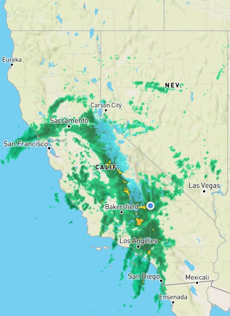 After a few miles, we reached a road and campground. We took cover in the covered pit toilet for a few minutes to talk about our situation and restrategize. Since we were already soaked through several layers and the temperature was expected to drop into the 20s overnight, we decided to try hailing a ride into town. Several cars passed us, cold and shivering on the side of the road. Just as we turned around to go back to the toilet, a young man driving a truck pulled over and offered us a ride. He invited us to sit in the cab (as we were dripping wet, we had offered to sit in the bed) and took us all the way to Ridgecrest rather than stopping in the closer but teeny tiny Inyokern. He dropped us off at a motel popular with hikers, waiting to make sure they had vacancy before driving off. He was one of the nicest people we have encountered out here, and we are eternally grateful.