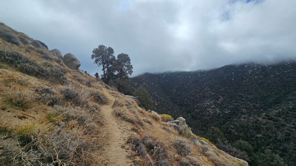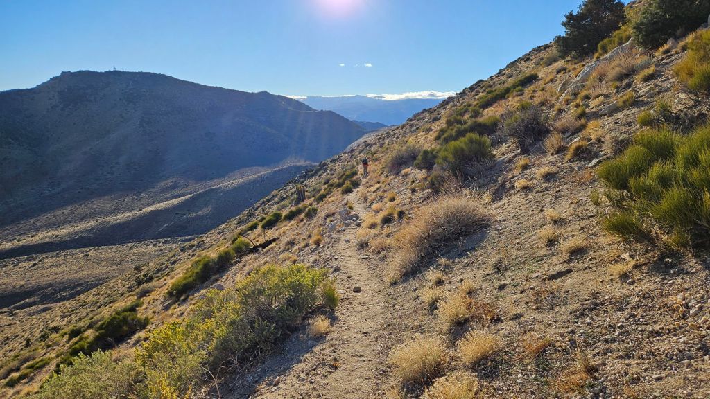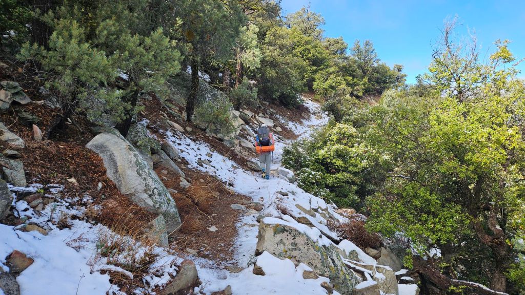 Powered by the unexpected rest and real meals of the prior day, we got up the big hill awaiting us on trail with speed. From there, it was dipping and bopping throughout the crestlines until we descended to another pass. Despite the rain/snow yesterday, the trail wasn’t terribly washed out or muddy. We just had to avoid a few puddles in parts. The remaining snow on the ground was insignificant, but pretty!