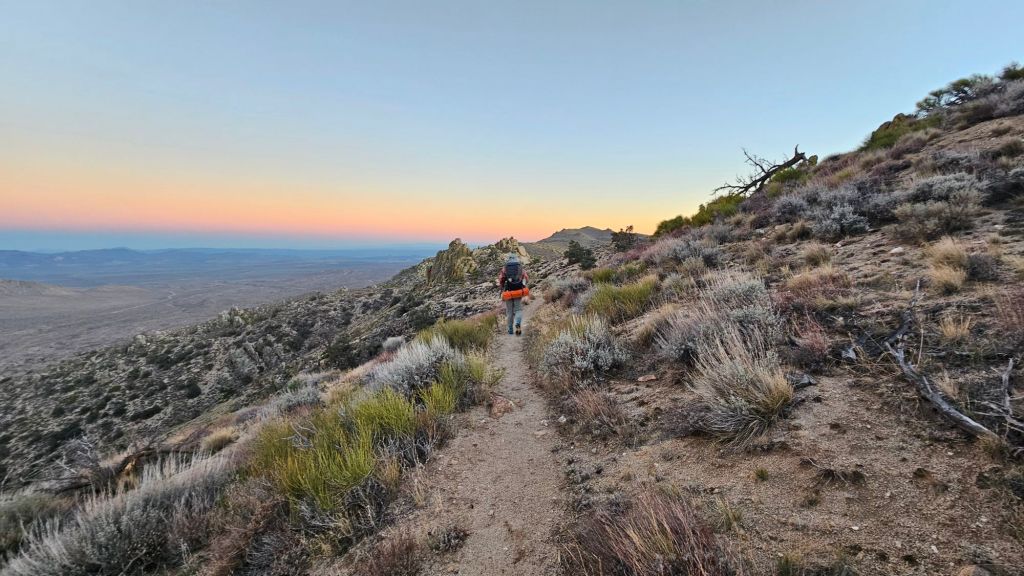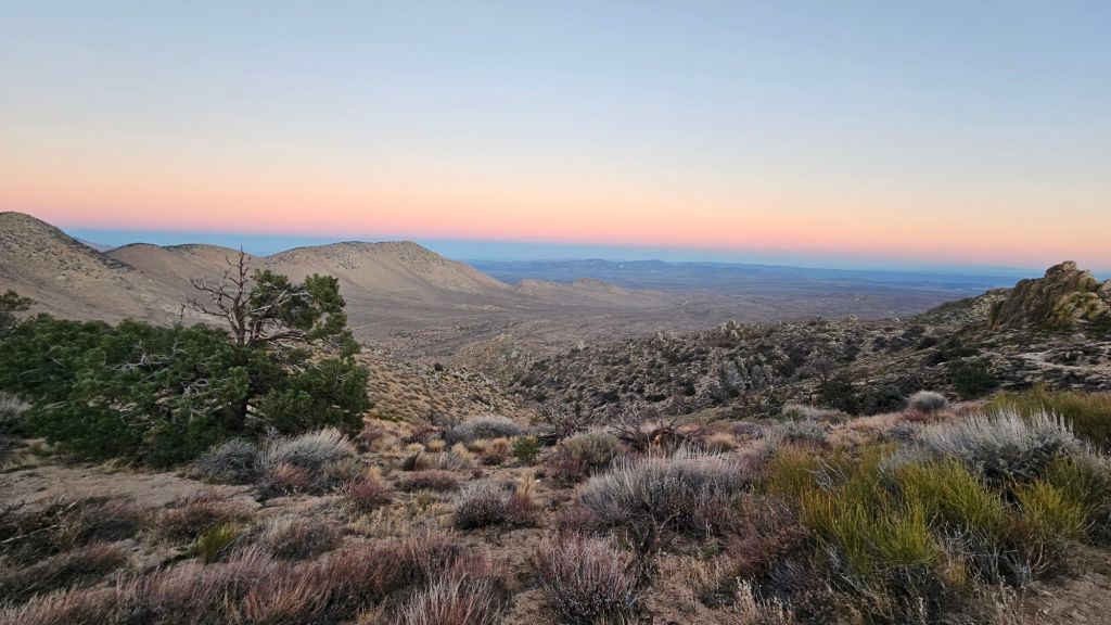 We refilled some water at a cache and powered up the next hills to camp. The setting sun painted the sky with pinks and purples.