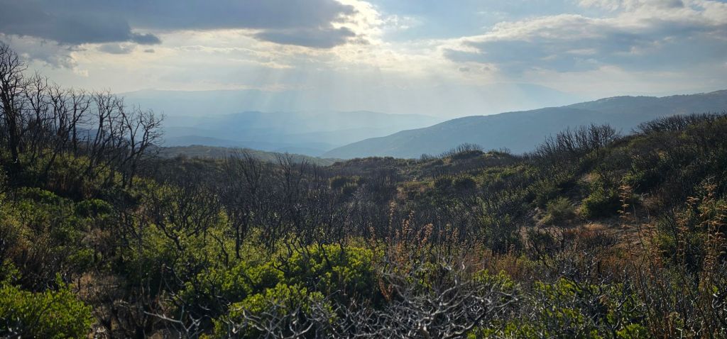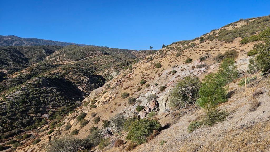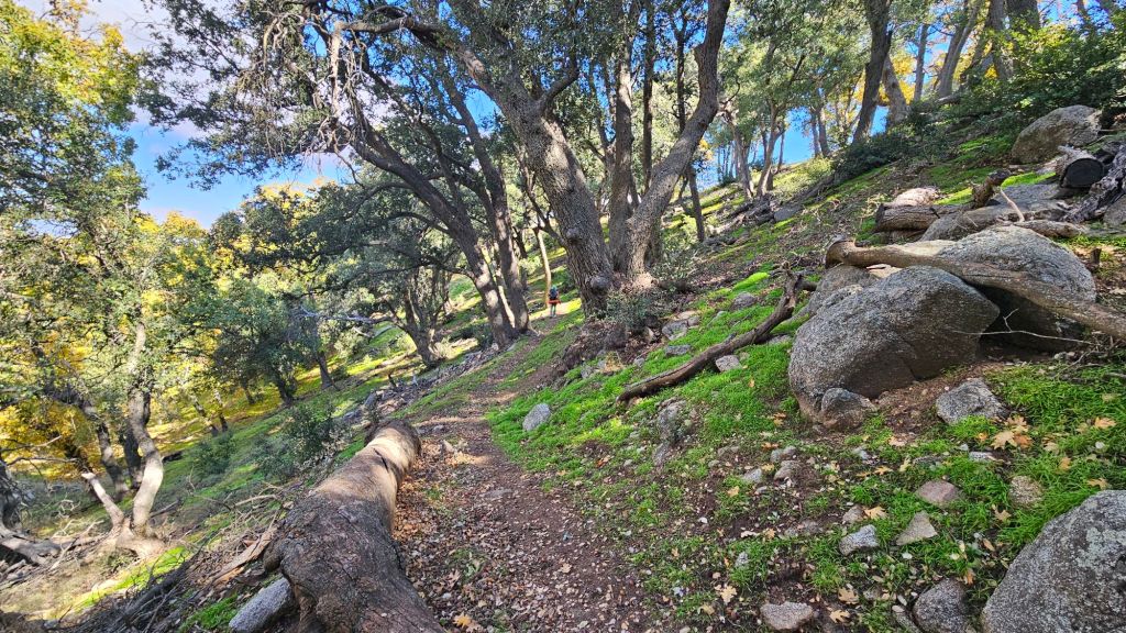 The craziest thing happened, though. As we climbed, the flora dramatically changed. We found ourselves in oak forests high above the desert below. It was lush and green under the trees. It was shady – in a good way! Unfortunately, these forests are thinned into strips, each separated by burn zones, which devastated the forest. In the burn zones, it was back to scrub and without any shade for our weary souls. Due to the extreme and dry conditions, it will be a long time until these burn zones regrow into the lush oak forests that we had, that is, if they can regrow in the same way, what with the changing climate and all that.