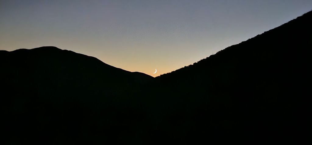 We climbed the last hill at dusk. The fading sunlight cast an eerie purple glow on the hills. A sliver of the moon was visible for just a few minutes between two ridges.