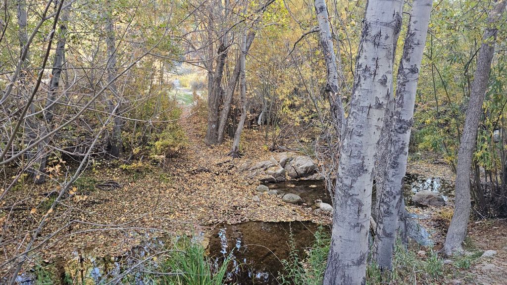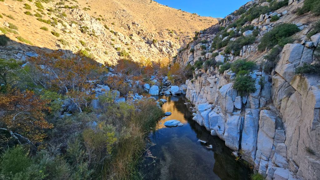 We readied ourselves for the final push to camp. We hiked on, stopping for water once more at the last source before camp. A dirtbike rider was there flying his drone up and down the creek. He probably got some great videos of the fall colors overhead and floating atop the water.